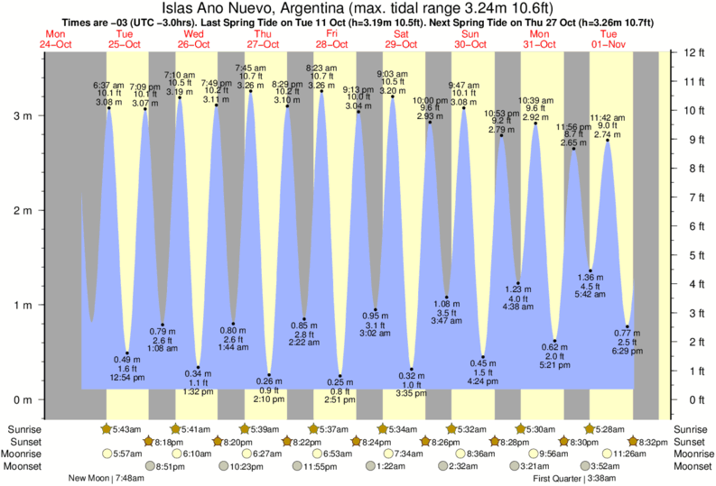 Tide Times are -03 (UTC -3.0hrs). Last Spring High Tide at Islas Ano Nuevo was on Sat 06 Dec (height: 3.34m 11.0ft). Next high Spring Tide at Islas Ano Nuevo will be on Mon 22 Dec (height: 2.98m 9.8ft).