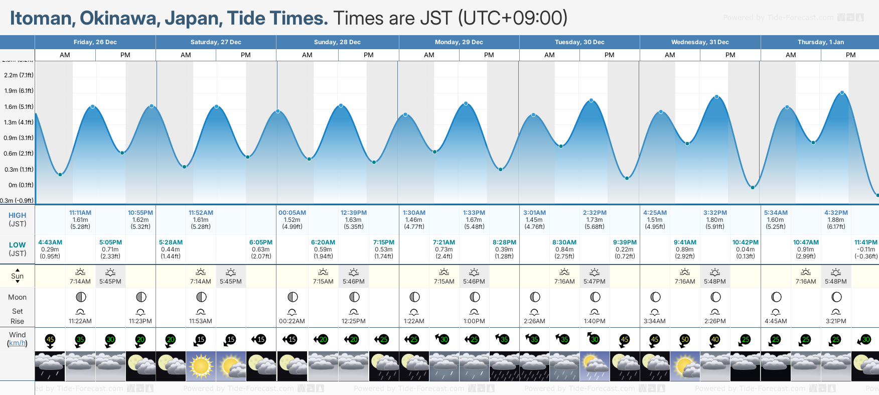 Tide chart for ItomanShowing low and high tide times for the next 30 days at Itoman. Tide Times are JST (UTC +9.0hrs).