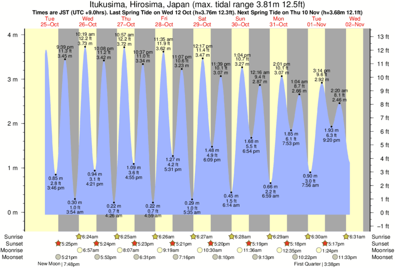 Tide chart for ItukusimaShowing low and high tide times for the next 30 days at Itukusima. Tide Times are JST (UTC +9.0hrs).