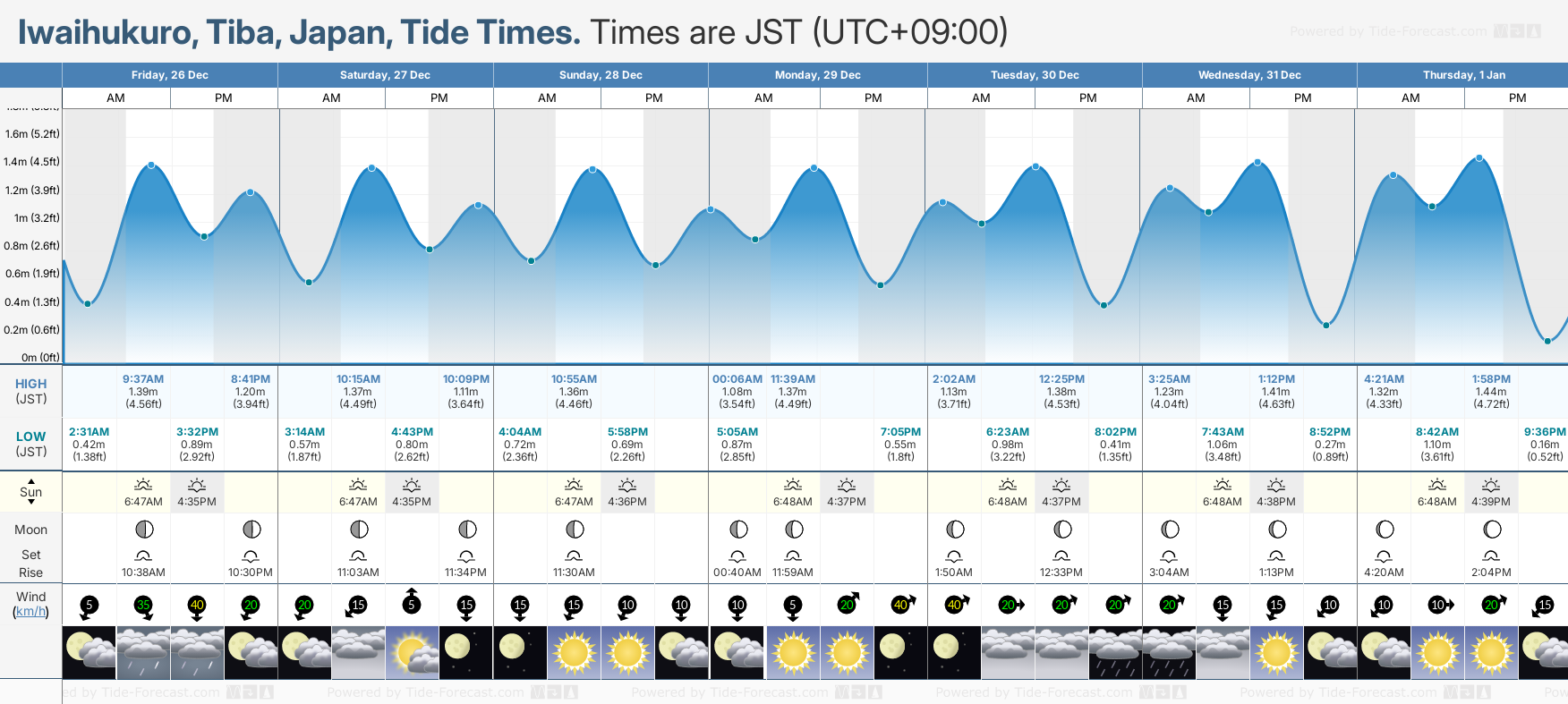 Tide Times are JST (UTC +9.0hrs). Last Spring High Tide at Iwaihukuro was on Mon 22 Dec (height: 1.55m 5.1ft). Next high Spring Tide at Iwaihukuro will be on Mon 05 Jan (height: 1.52m 5.0ft).