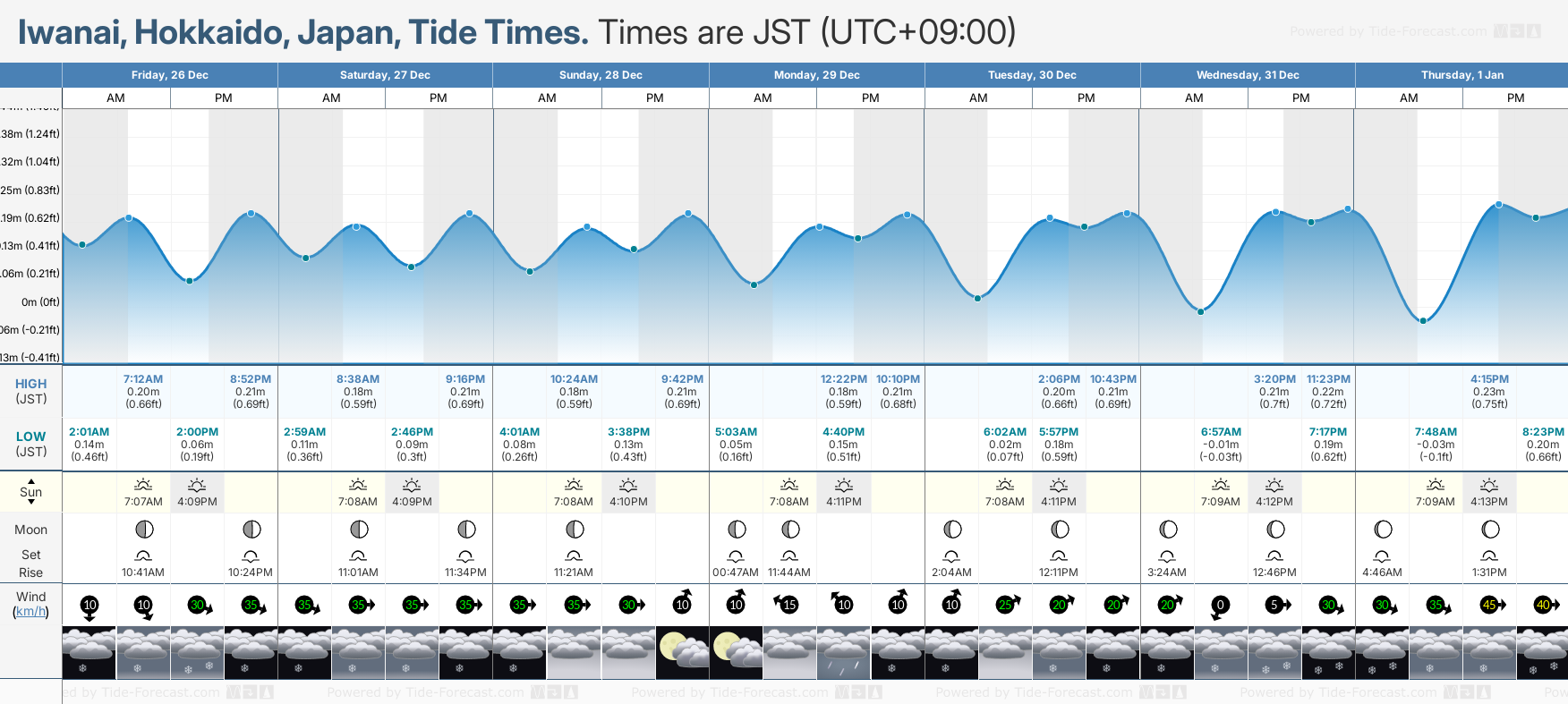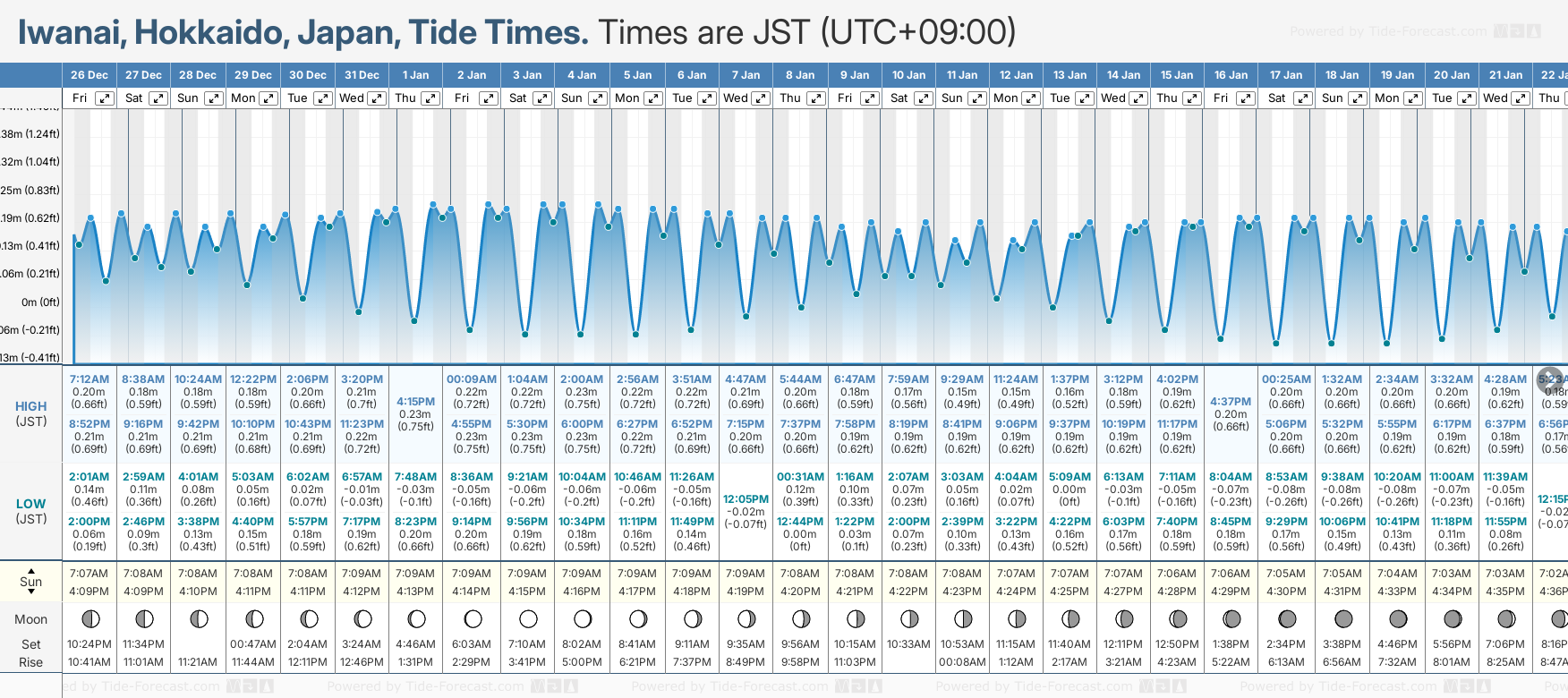 Tide Times are JST (UTC +9.0hrs). Last Spring High Tide at Iwanai was on Mon 22 Dec (height: 0.26m 0.9ft). Next high Spring Tide at Iwanai will be on Mon 29 Dec (height: 0.21m 0.7ft).
