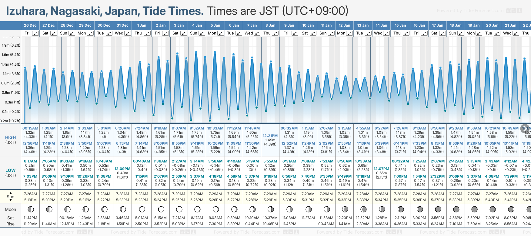 December and January Tide charts for Izuhara: The tide charts below show the height, time and date of high and low tides for the next 30 days.