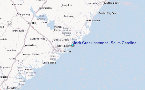 Use this relief map to navigate to tide stations, surf breaks and cities that are in the area of Jack Creek entrance, South Carolina.