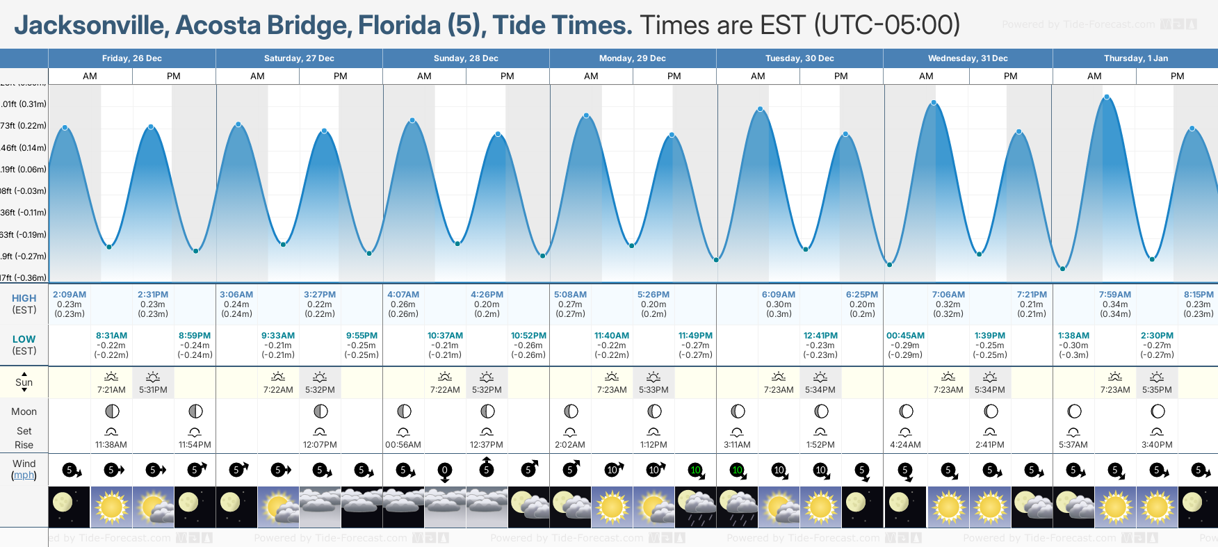Tide chart for Jacksonville, Acosta Bridge (5)Showing low and high tide times for the next 30 days at Jacksonville, Acosta Bridge (5). Tide Times are EST (UTC -5.0hrs).