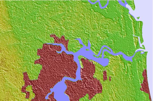 Use this relief map to navigate to tide stations, surf breaks and cities that are in the area of Jacksonville, Navy fuel depot, Florida.