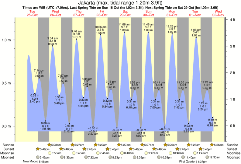 Tide Times are WIB (UTC +7.0hrs). Last Spring High Tide at Jakarta was on Sun 07 Dec (height: 1.13m 3.7ft). Next high Spring Tide at Jakarta will be on Mon 22 Dec (height: 1.08m 3.5ft).