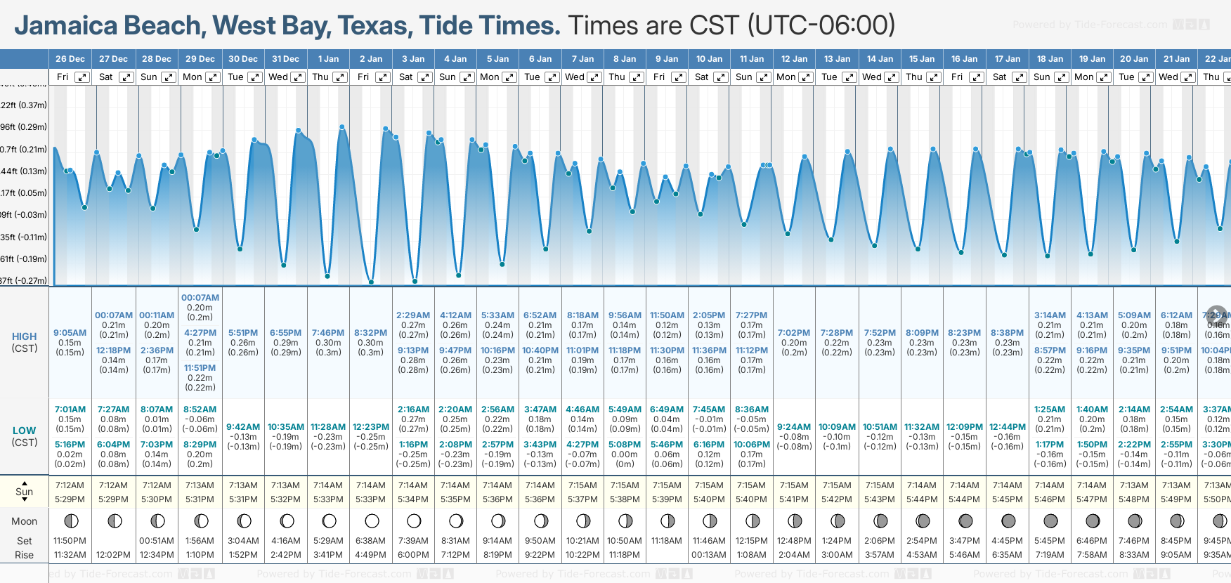 December and January Tide charts for Jamaica Beach: The tide charts below show the height, time and date of high and low tides for the next 30 days.