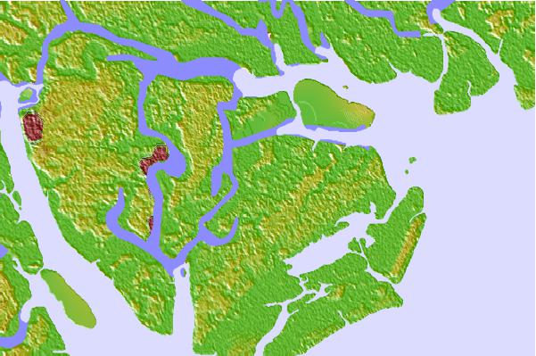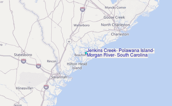Use this relief map to navigate to tide stations, surf breaks and cities that are in the area of Jenkins Creek, Polawana Island, Morgan River, South Carolina.