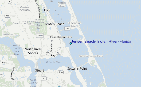 Use this relief map to navigate to tide stations, surf breaks and cities that are in the area of Jensen Beach, Indian River, Florida.