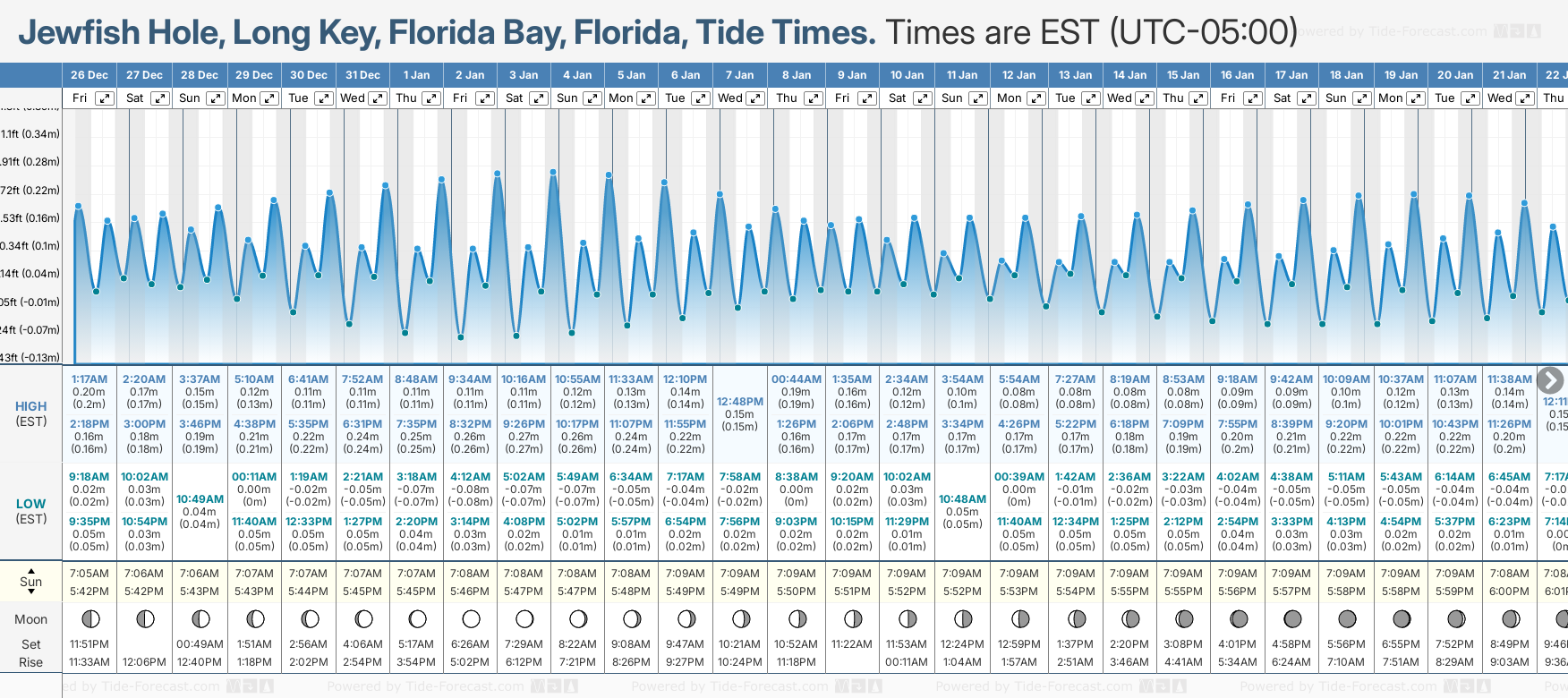 December and January Tide charts for Jewfish Hole, Long Key Bay: The tide charts below show the height, time and date of high and low tides for the next 30 days.
