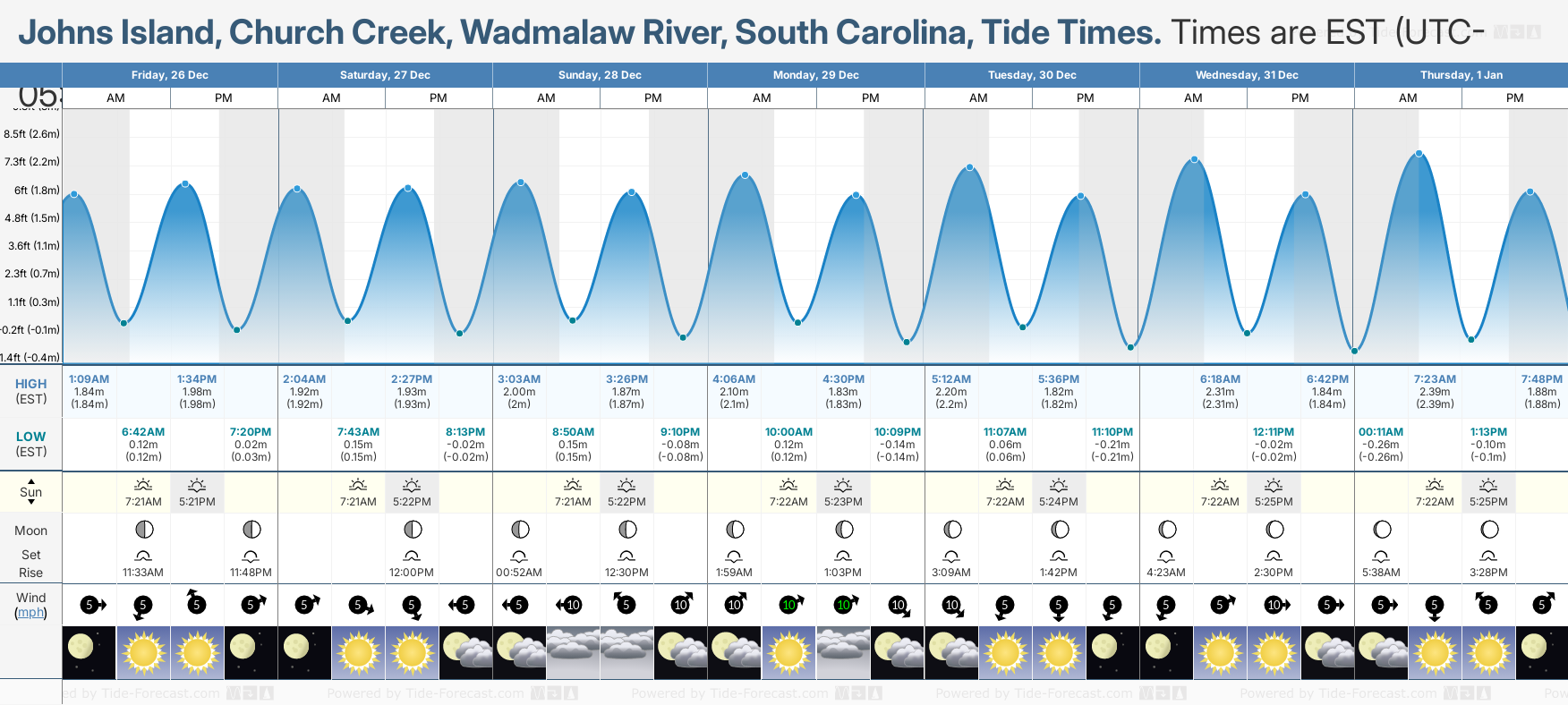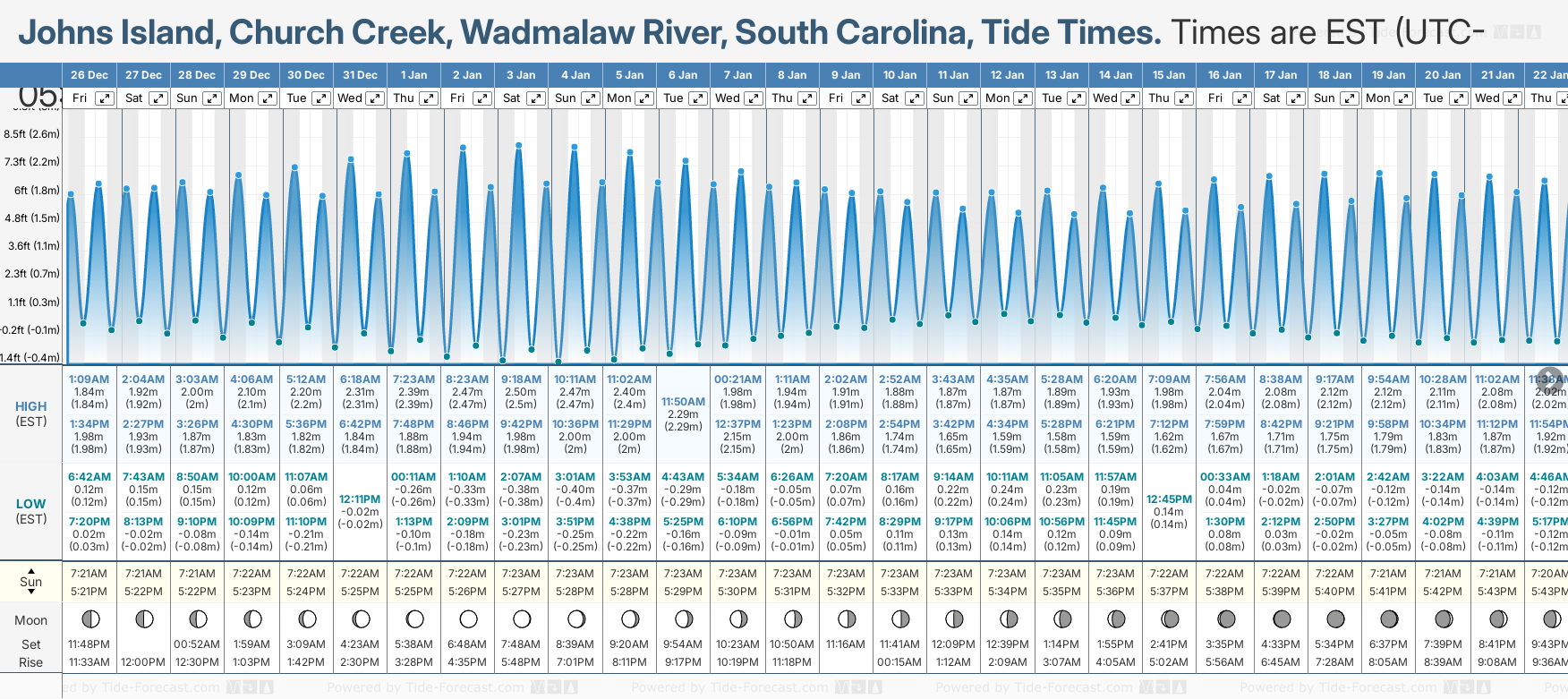 December and January Tide charts for Johns Island, Church Creek, Wadmalaw River: The tide charts below show the height, time and date of high and low tides for the next 30 days.