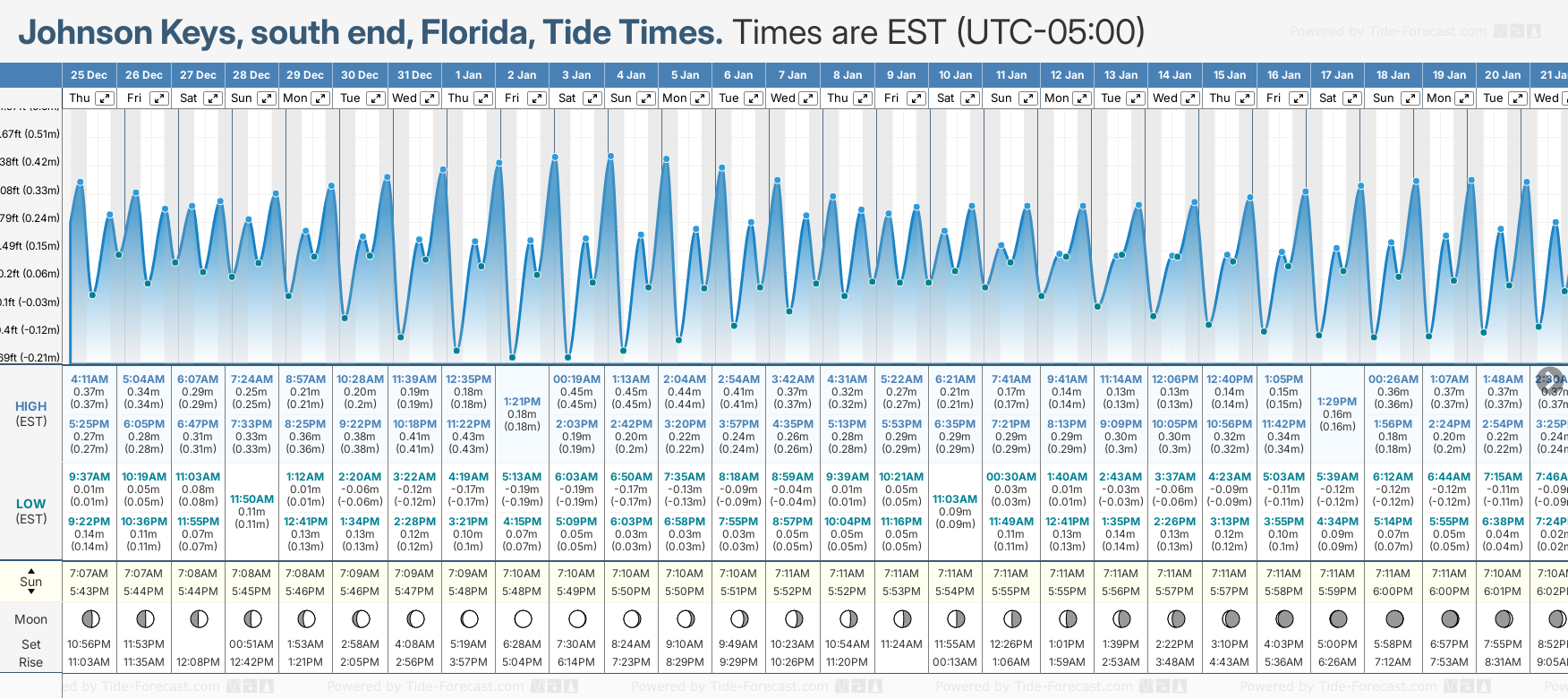 Tide Times are EST (UTC -5.0hrs). Last Spring High Tide at Johnson Keys, south end was on Sun 21 Dec (height: 0.41m 1.3ft). Next high Spring Tide at Johnson Keys, south end will be on Fri 02 Jan (height: 0.45m 1.5ft).