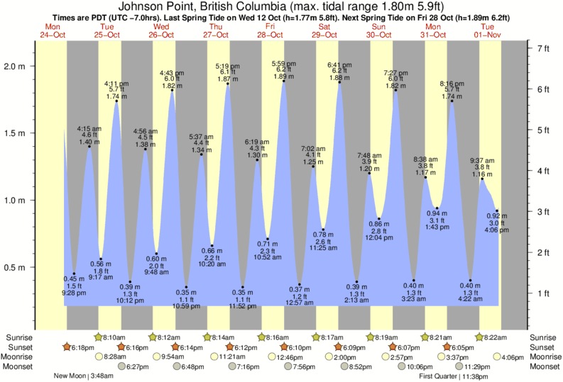 Johnson Point tide chart key: The tide chart above shows the height and times of high tide and low tide for Johnson Point, British Columbia. The grey shading corresponds to nighttime hours between sunset and sunrise at Johnson Point.