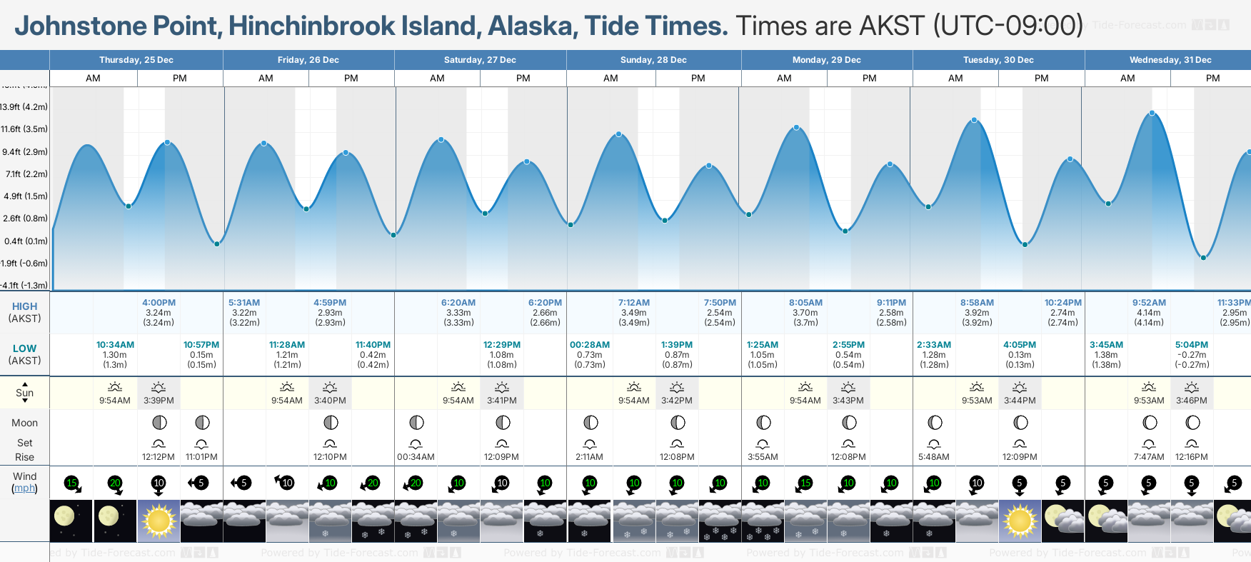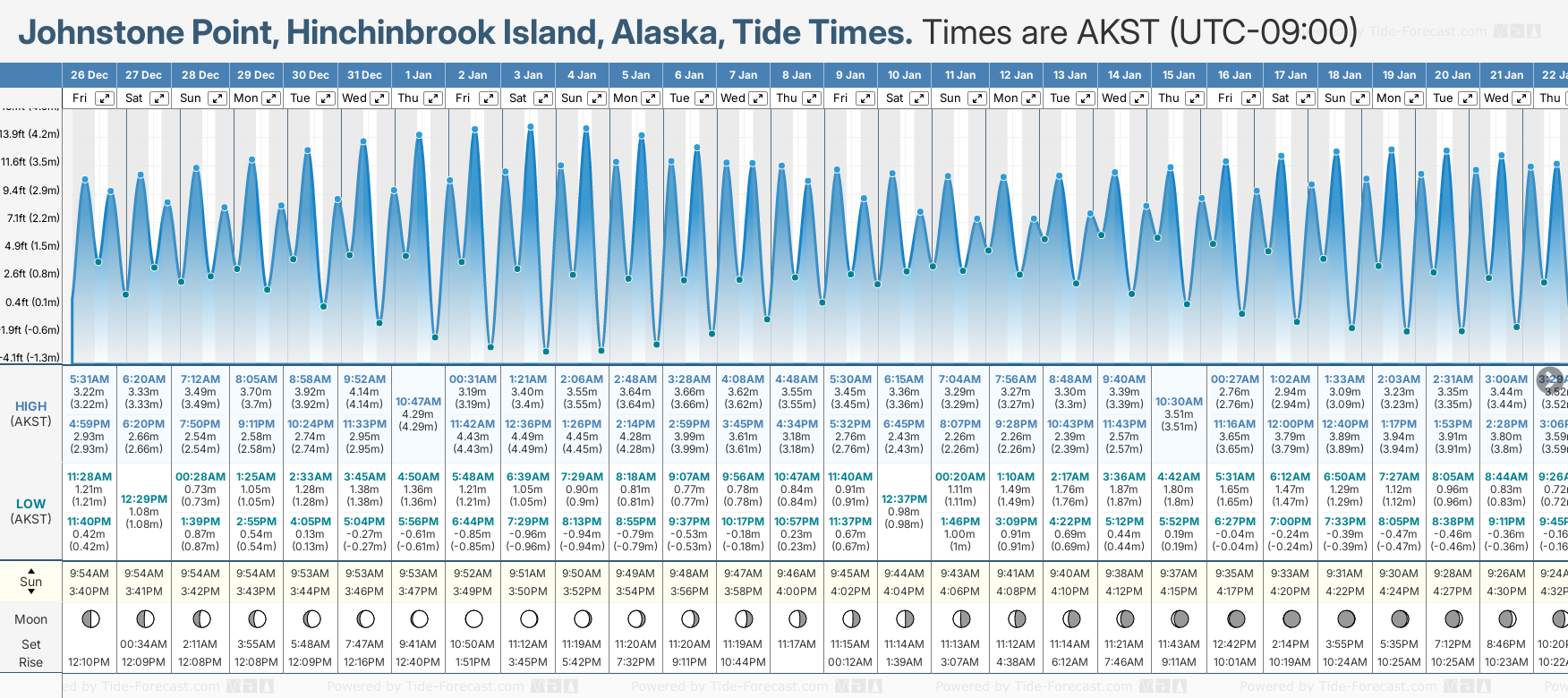 Tide chart for Johnstone Point, Hinchinbrook IslandShowing low and high tide times for the next 30 days at Johnstone Point, Hinchinbrook Island. Tide Times are AKST (UTC -9.0hrs).
