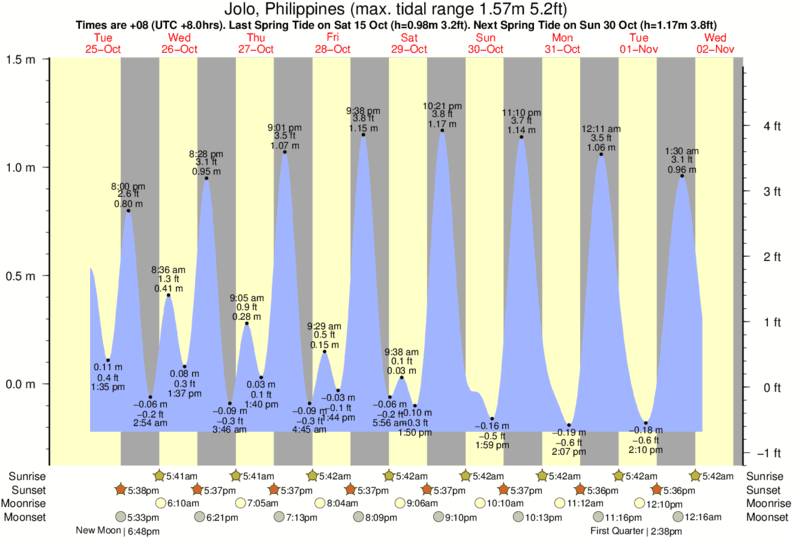 Tide Times are PST (UTC +8.0hrs). Last Spring High Tide at Jolo was on Sun 07 Dec (height: 1.38m 4.5ft). Next high Spring Tide at Jolo will be on Mon 22 Dec (height: 1.11m 3.6ft).