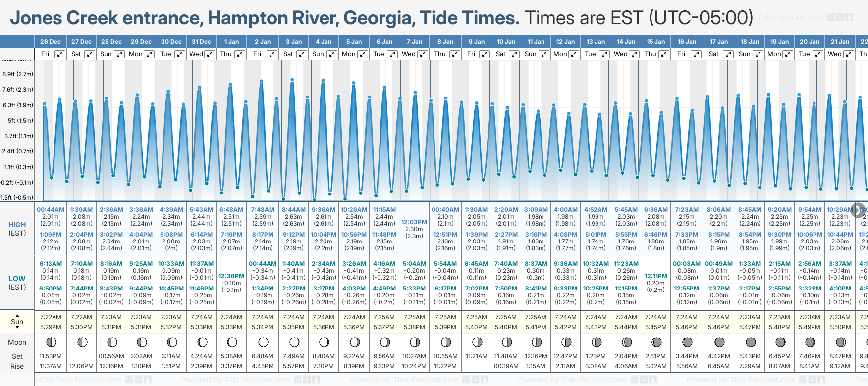 December and January Tide charts for Jones Creek entrance, Hampton River: The tide charts below show the height, time and date of high and low tides for the next 30 days.