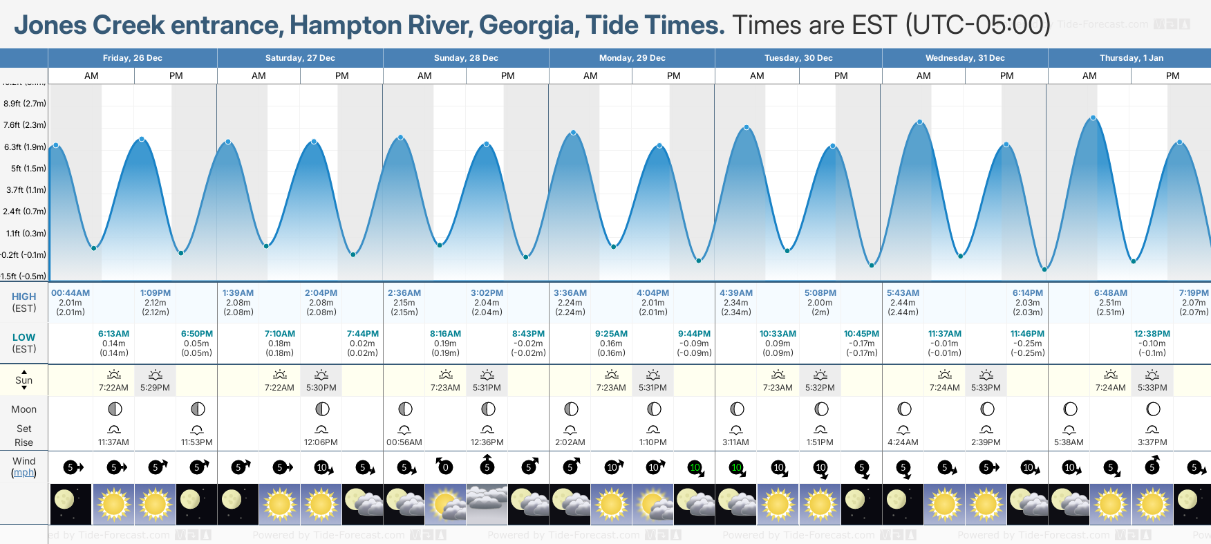 Tide chart for Jones Creek entrance, Hampton RiverShowing low and high tide times for the next 30 days at Jones Creek entrance, Hampton River. Tide Times are EST (UTC -5.0hrs).