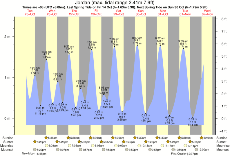 Tide Times are PST (UTC +8.0hrs). Last Spring High Tide at Jordan was on Sun 07 Dec (height: 2.27m 7.4ft). Next high Spring Tide at Jordan will be on Mon 22 Dec (height: 1.99m 6.5ft).