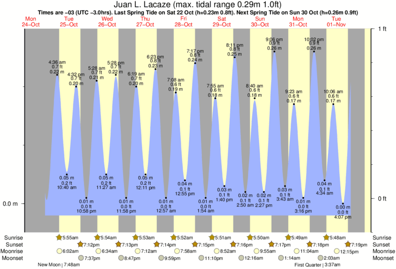 Tide Times are -03 (UTC -3.0hrs). Last Spring High Tide at Juan L. Lacaze was on Mon 08 Dec (height: 0.27m 0.9ft). Next high Spring Tide at Juan L. Lacaze will be on Sun 21 Dec (height: 0.24m 0.8ft).