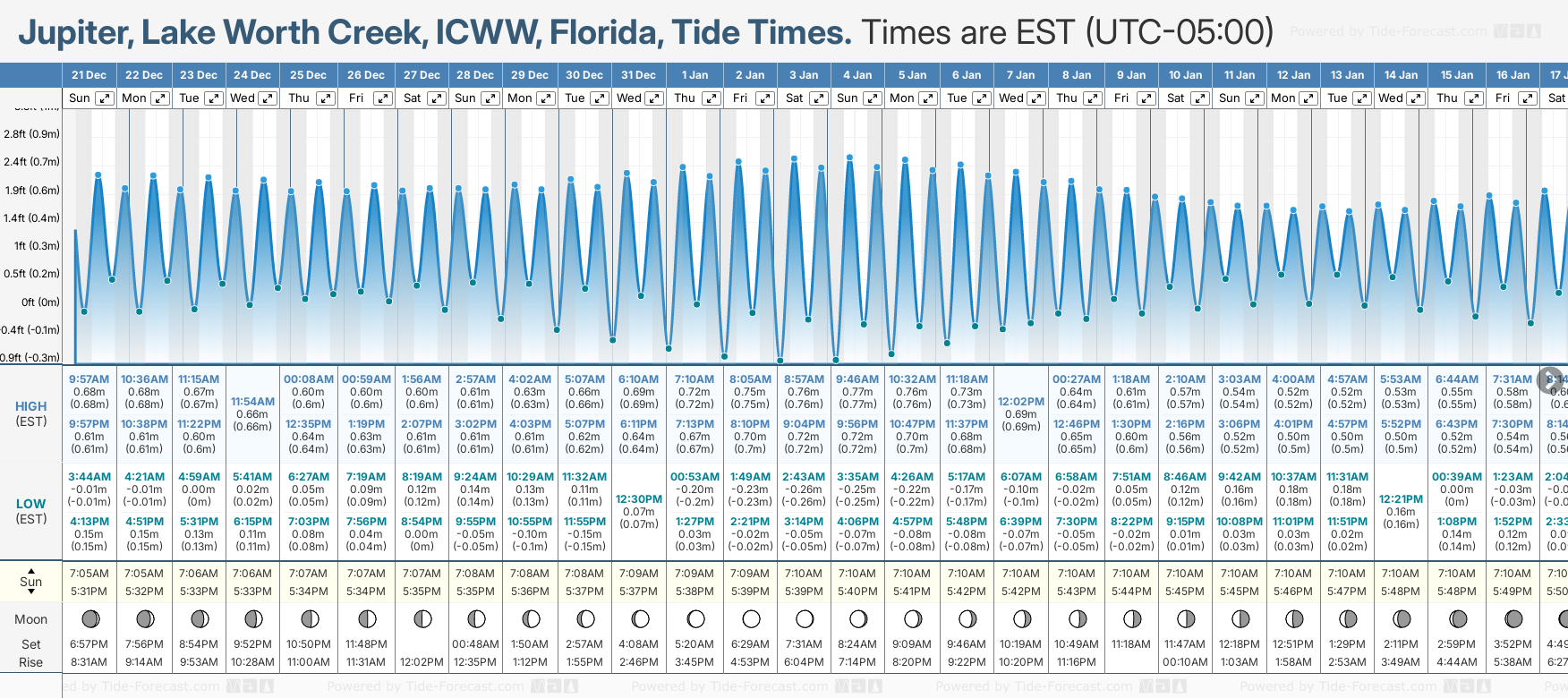 Tide Times for Jupiter, Lake Worth Creek, ICWW: Monday 05 January 2026