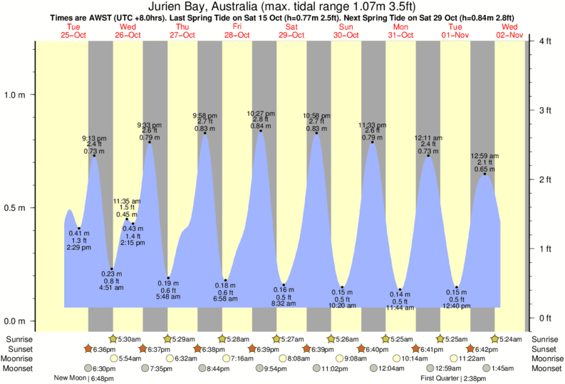 Tide Times are AWST (UTC +8.0hrs). Last Spring High Tide at Jurien Bay was on Sat 06 Dec (height: 0.96m 3.1ft). Next high Spring Tide at Jurien Bay will be on Sun 21 Dec (height: 0.91m 3.0ft).