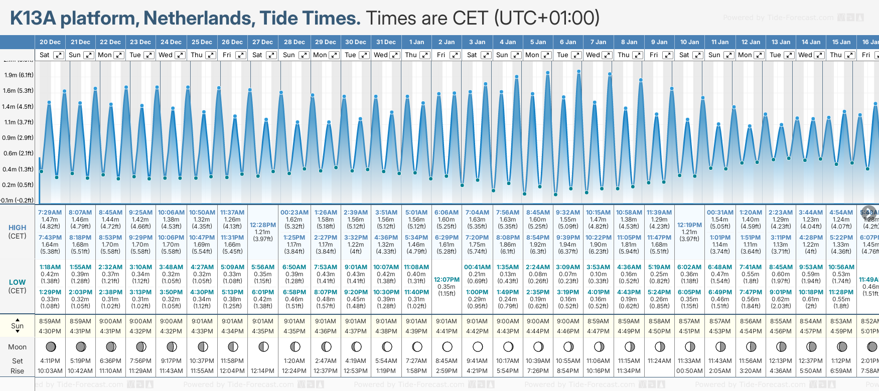 Tide Times are CET (UTC +1.0hrs). Last Spring High Tide at K13A platform was on Mon 08 Dec (height: 1.84m 6.0ft). Next high Spring Tide at K13A platform will be on Mon 22 Dec (height: 1.70m 5.6ft).