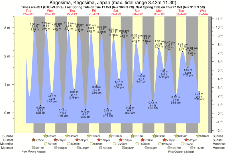 Tide chart for KagosimaShowing low and high tide times for the next 30 days at Kagosima. Tide Times are JST (UTC +9.0hrs).