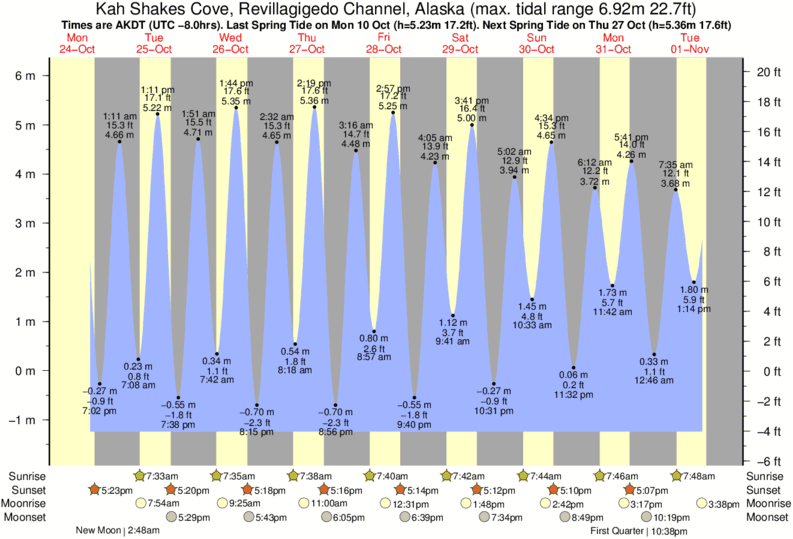 Tide chart for Kah Shakes Cove, Revillagigedo ChannelShowing low and high tide times for the next 30 days at Kah Shakes Cove, Revillagigedo Channel. Tide Times are AKST (UTC -9.0hrs).