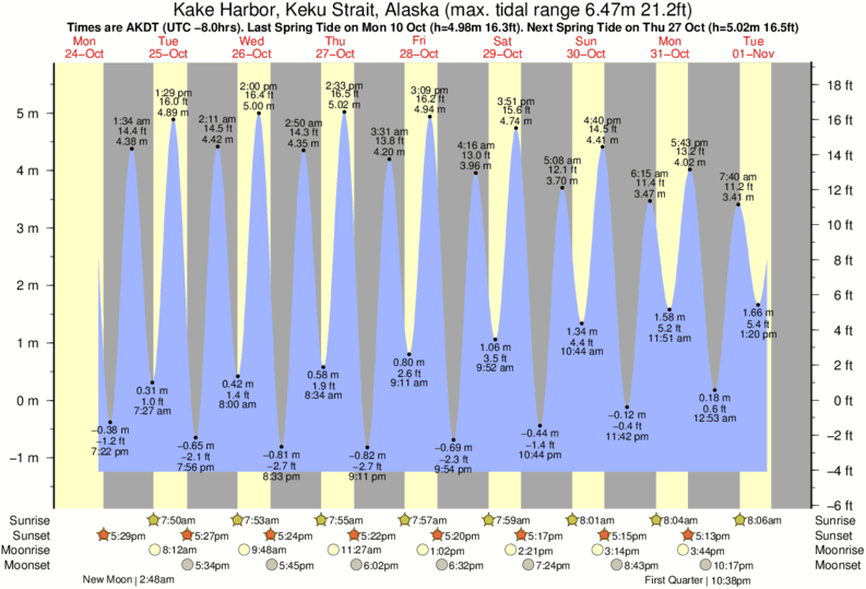Tide Times are AKST (UTC -9.0hrs). Last Spring High Tide at Kake Harbor, Keku Strait was on Fri 05 Dec (height: 5.34m 17.5ft). Next high Spring Tide at Kake Harbor, Keku Strait will be on Sat 20 Dec (height: 4.39m 14.4ft).