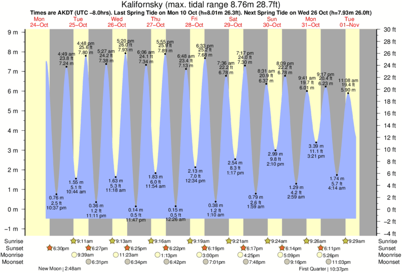 Tide Times are AKST (UTC -9.0hrs). Last Spring High Tide at Kalifornsky was on Fri 05 Dec (height: 8.18m 26.8ft). Next high Spring Tide at Kalifornsky will be on Sun 21 Dec (height: 7.05m 23.1ft).