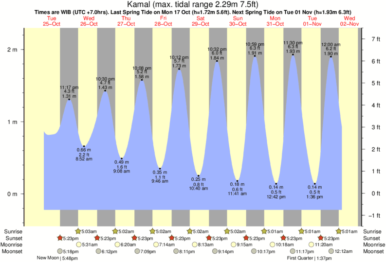 Tide Times are WIB (UTC +7.0hrs). Last Spring High Tide at Kamal was on Tue 09 Dec (height: 2.05m 6.7ft). Next high Spring Tide at Kamal will be on Wed 24 Dec (height: 1.95m 6.4ft).