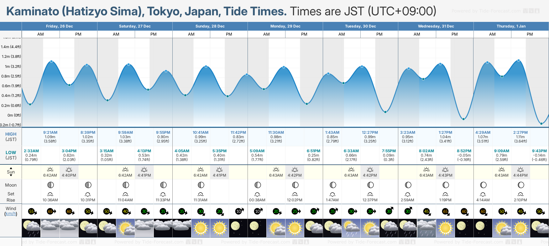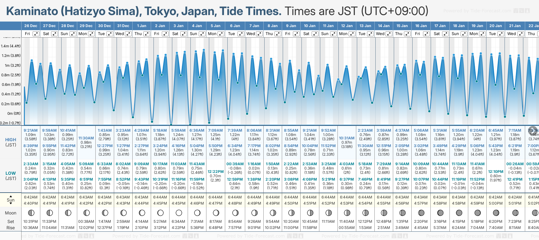 December and January Tide charts for Kaminato (Hatizyo Sima): The tide charts below show the height, time and date of high and low tides for the next 30 days.