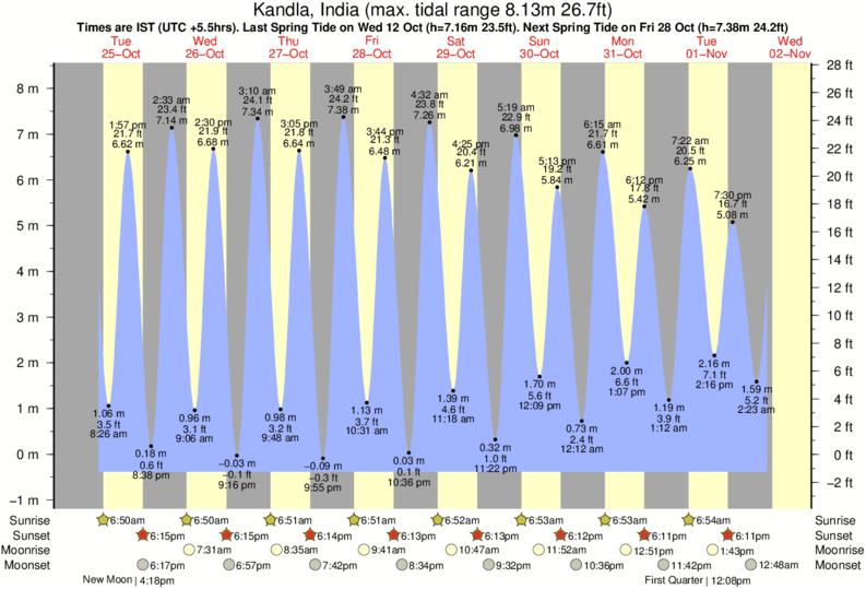 Tide Times are IST (UTC +5.5hrs). Last Spring High Tide at Kandla was on Sat 06 Dec (height: 7.64m 25.1ft). Next high Spring Tide at Kandla will be on Mon 22 Dec (height: 6.77m 22.2ft).