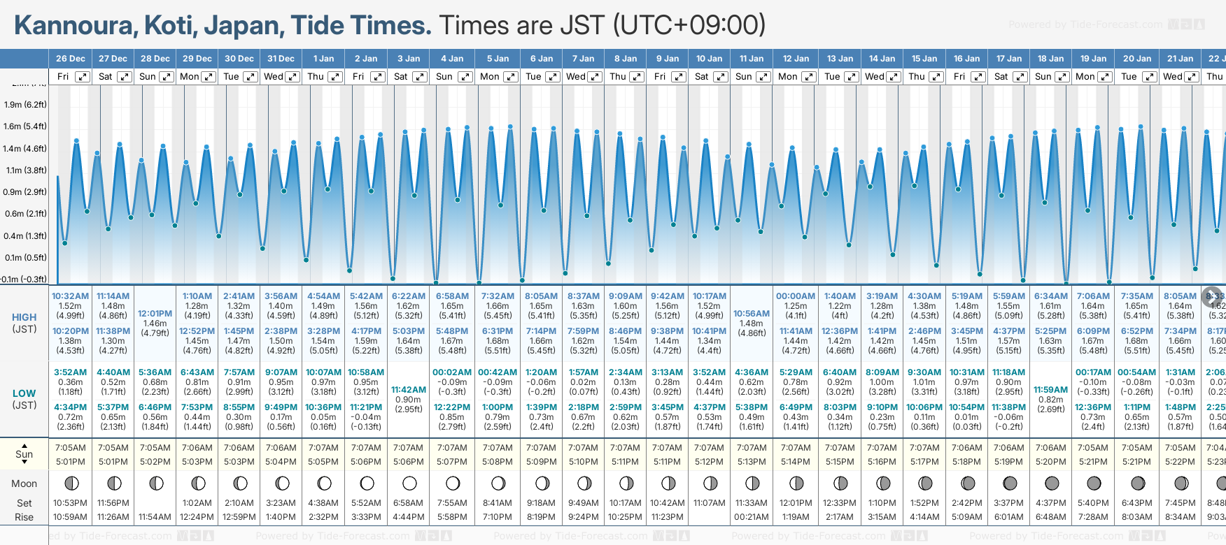 December and January Tide charts for Kannoura: The tide charts below show the height, time and date of high and low tides for the next 30 days.