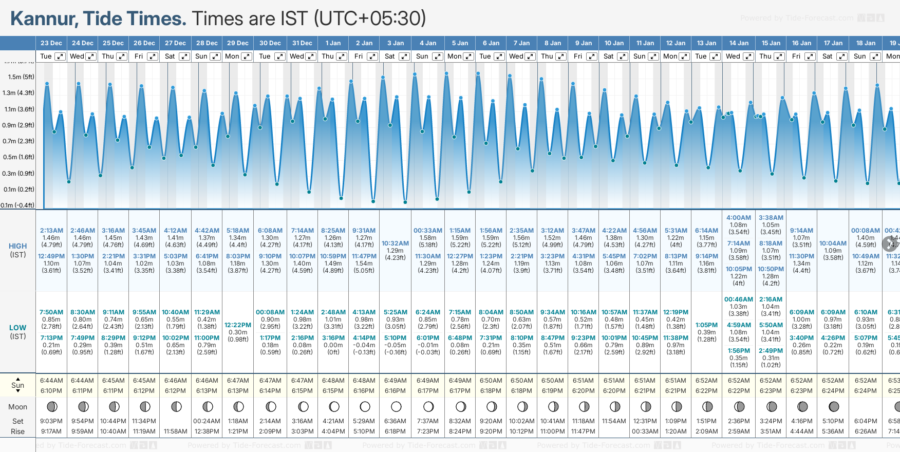 December and January Tide charts for Kannur: The tide charts below show the height, time and date of high and low tides for the next 30 days.