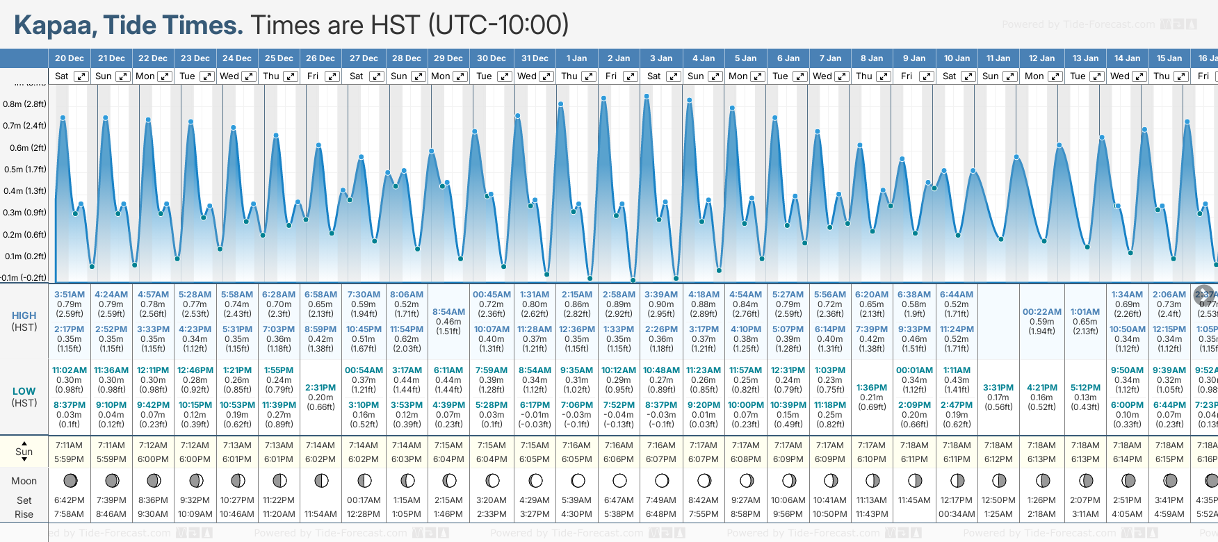 Tide chart for KapaaShowing low and high tide times for the next 30 days at Kapaa. Tide Times are HST (UTC -10.0hrs).
