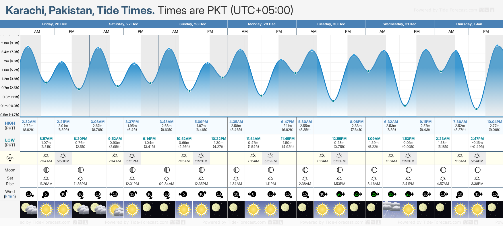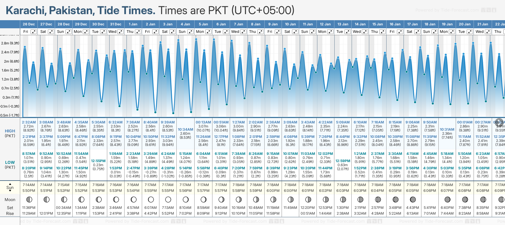 Tide chart for KarachiShowing low and high tide times for the next 30 days at Karachi. Tide Times are PKT (UTC +5.0hrs).