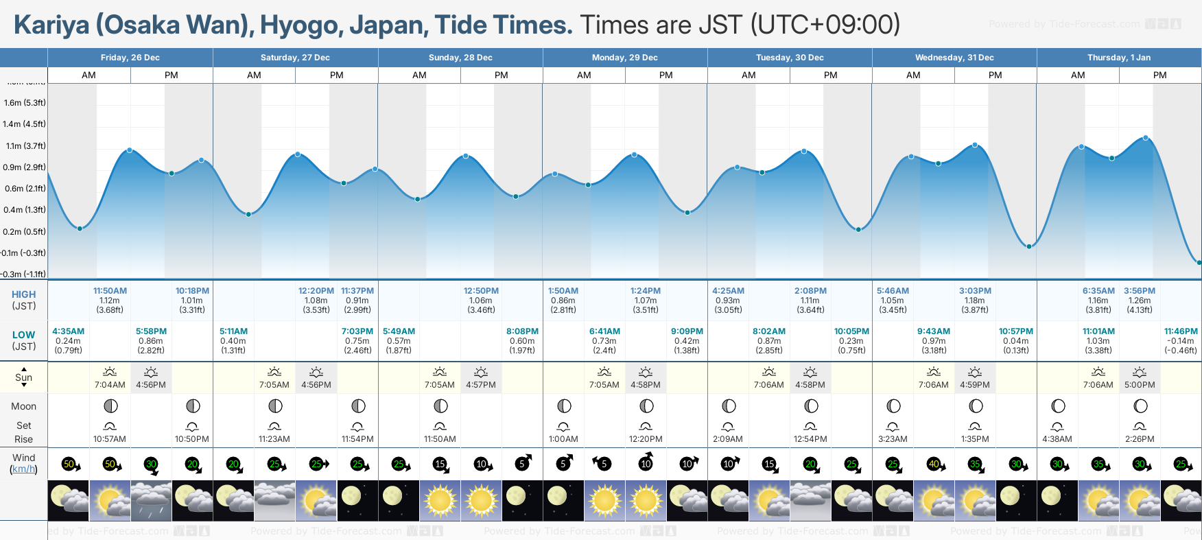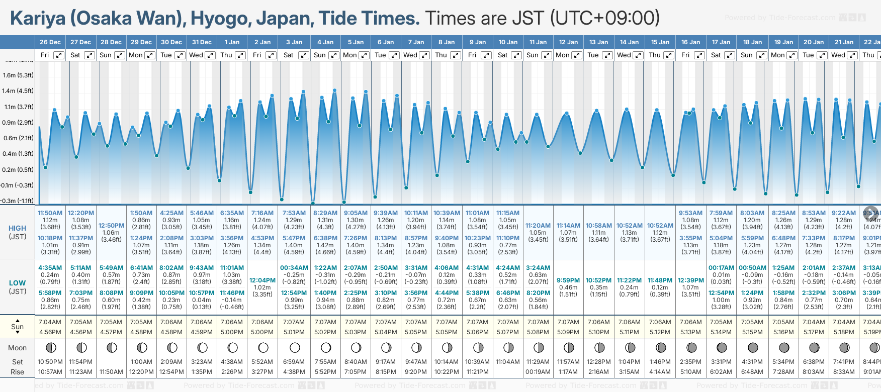 December and January Tide charts for Kariya (Osaka Wan): The tide charts below show the height, time and date of high and low tides for the next 30 days.