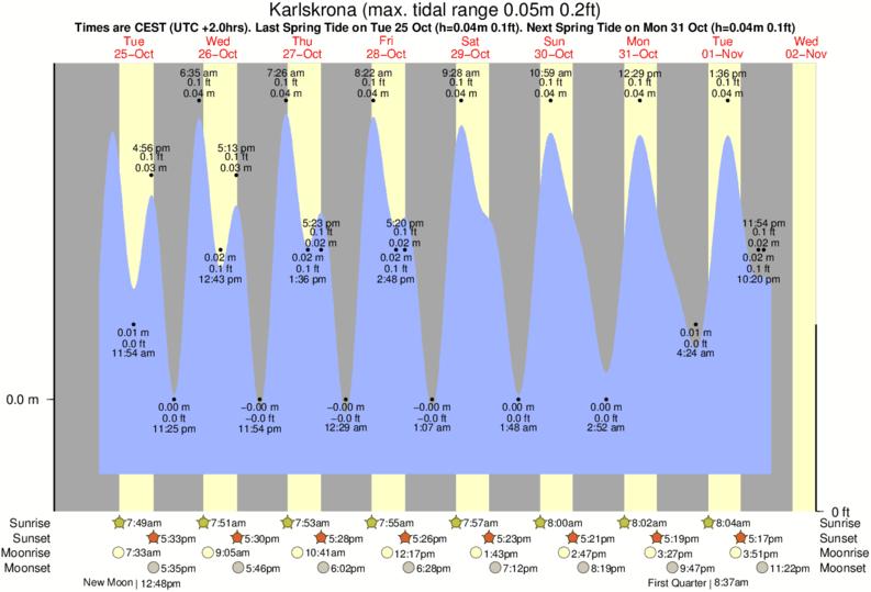 Tide chart for KarlskronaShowing low and high tide times for the next 30 days at Karlskrona. Tide Times are CET (UTC +1.0hrs).