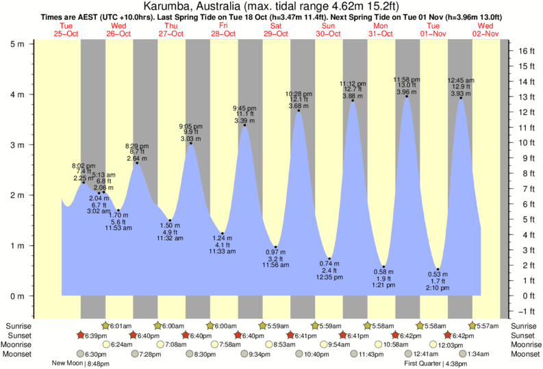 Tide Times are AEST (UTC +10.0hrs). Last Spring High Tide at Karumba was on Tue 09 Dec (height: 4.51m 14.8ft). Next high Spring Tide at Karumba will be on Tue 23 Dec (height: 4.36m 14.3ft).