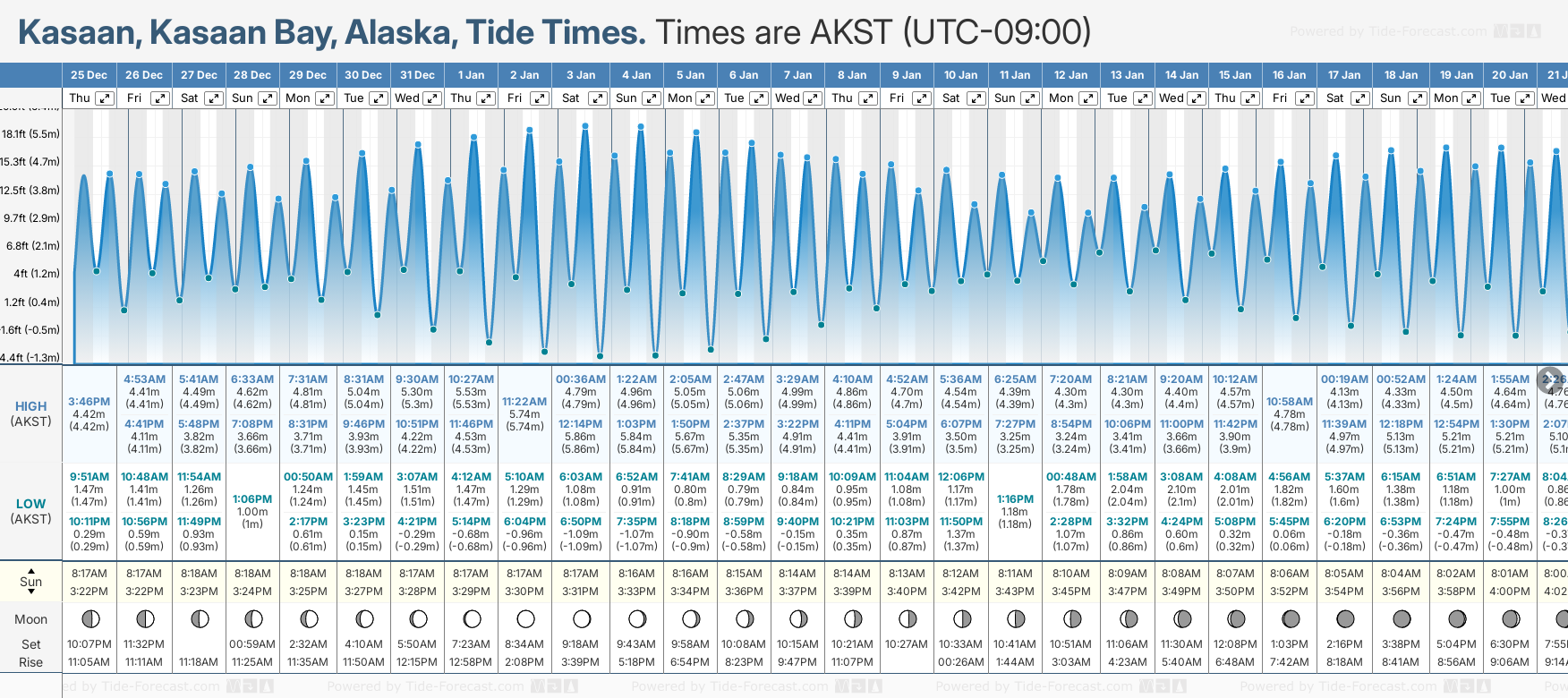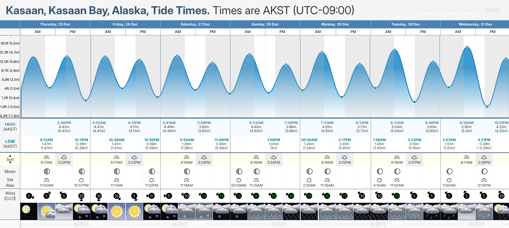 December and January Tide charts for Kasaan, Kasaan Bay: The tide charts below show the height, time and date of high and low tides for the next 30 days.