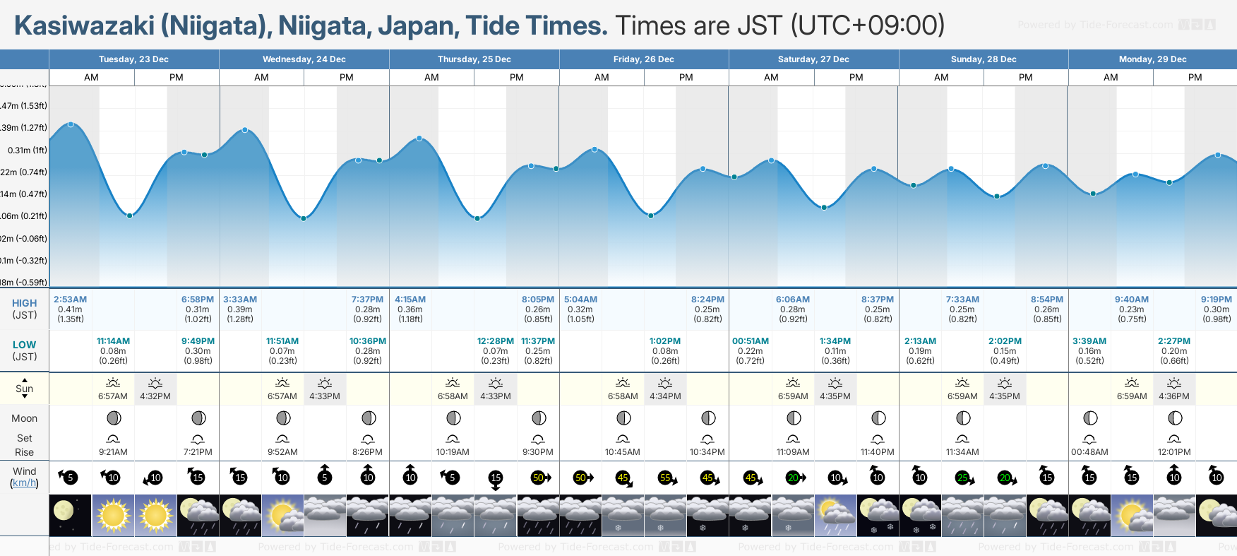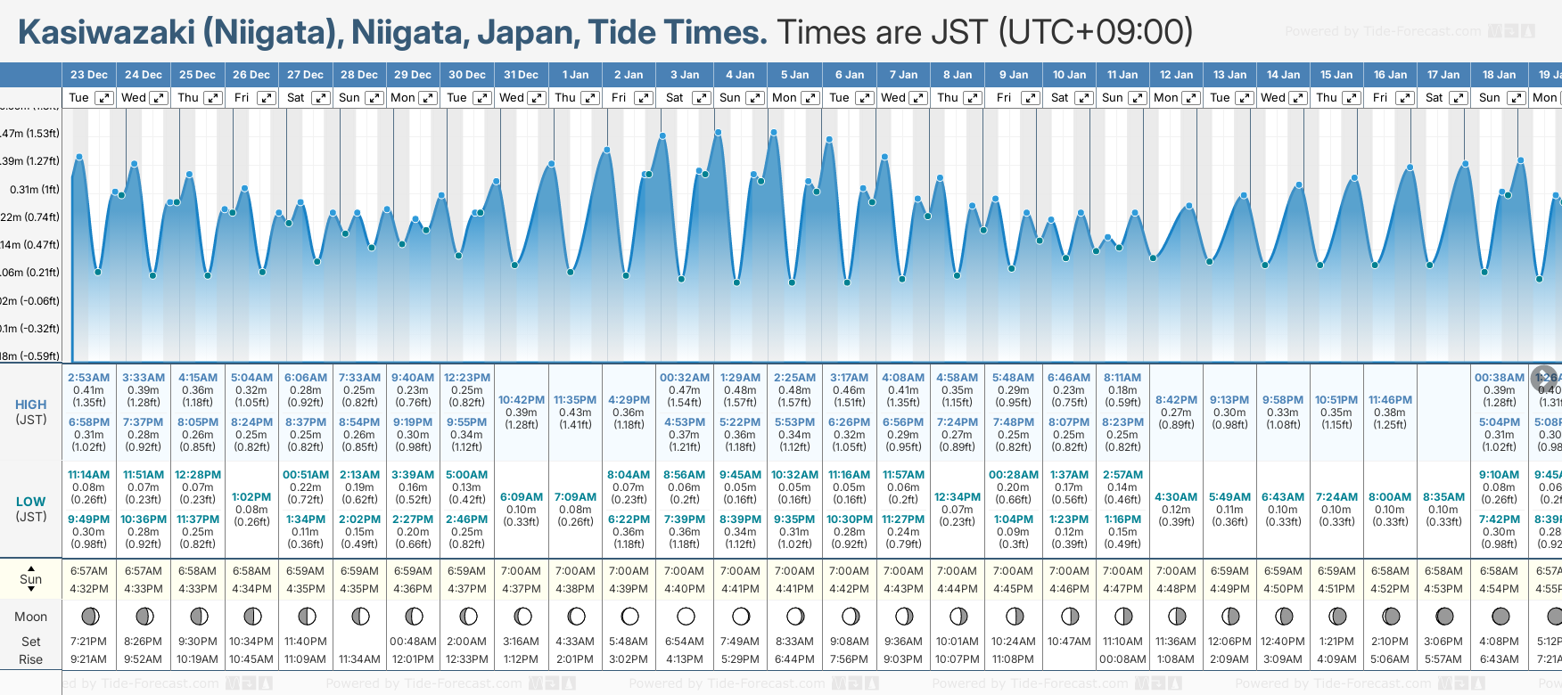 December and January Tide charts for Kasiwazaki (Niigata): The tide charts below show the height, time and date of high and low tides for the next 30 days.