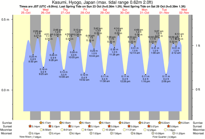 Kasumi tide chart key: The tide chart above shows the height and times of high tide and low tide for Kasumi, Hyogo, Japan. The grey shading corresponds to nighttime hours between sunset and sunrise at Kasumi.