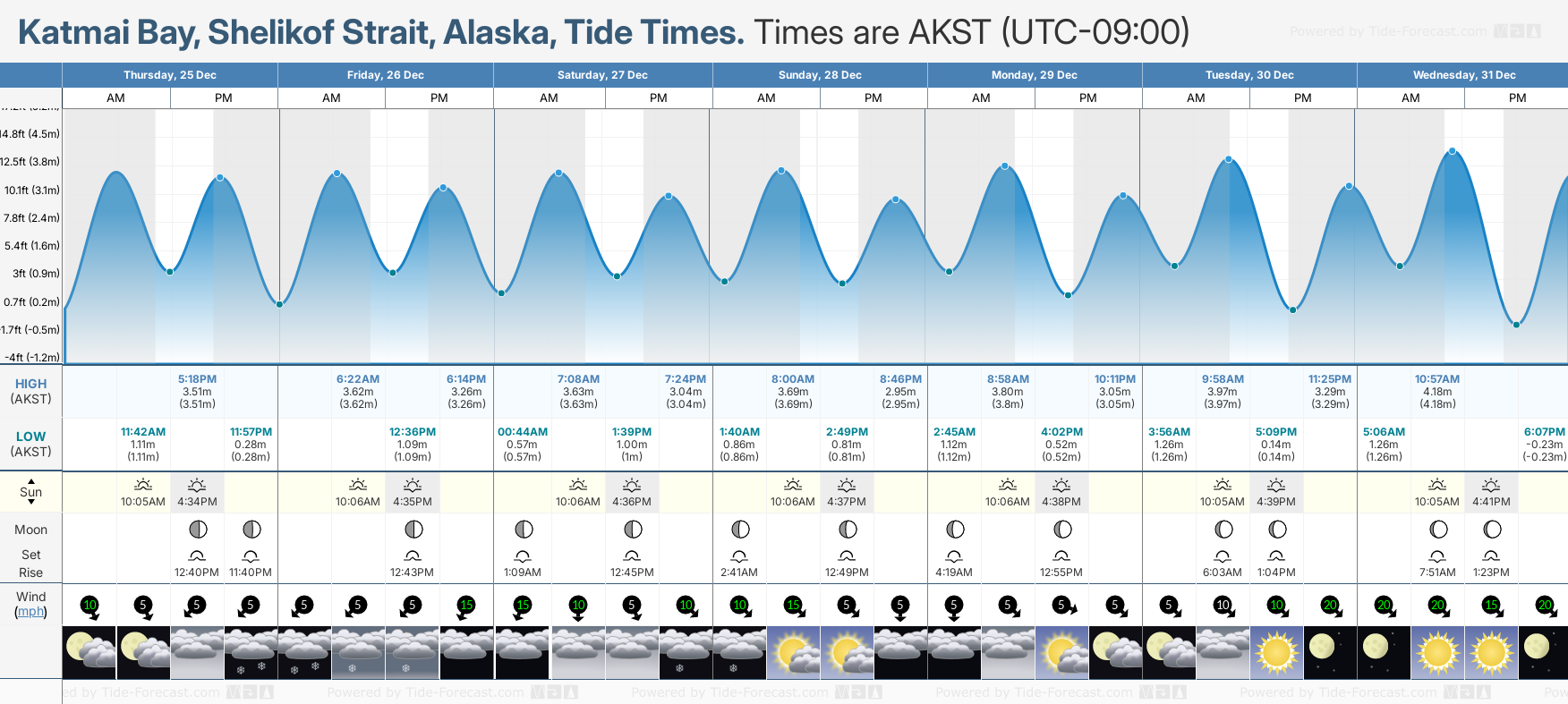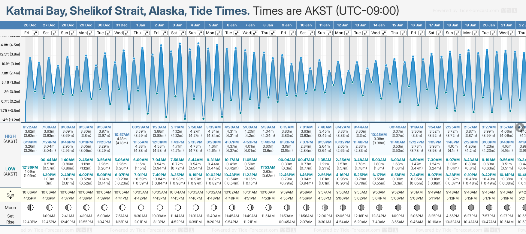 December and January Tide charts for Katmai Bay, Shelikof Strait: The tide charts below show the height, time and date of high and low tides for the next 30 days.