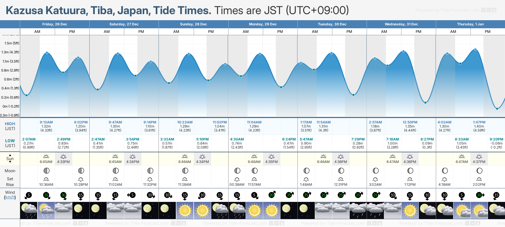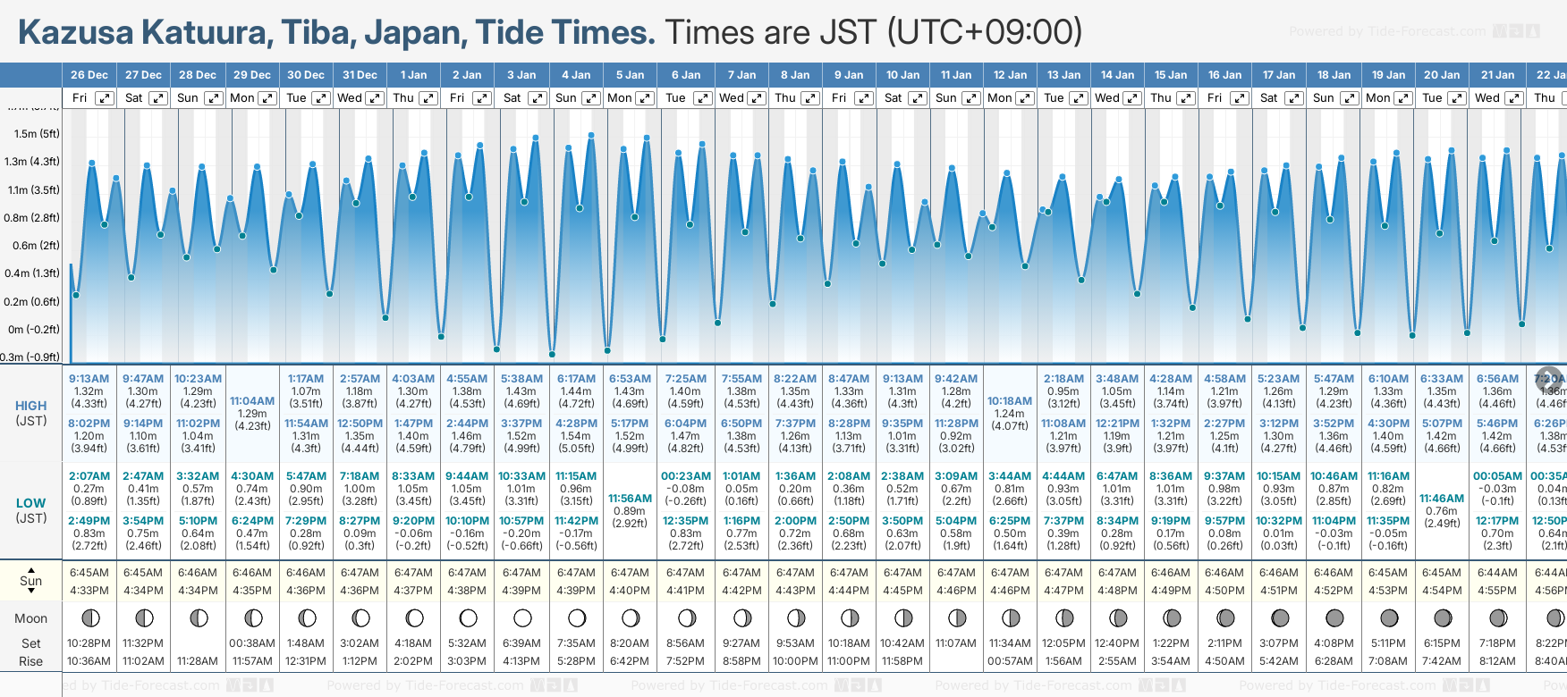 December and January Tide charts for Kazusa Katuura: The tide charts below show the height, time and date of high and low tides for the next 30 days.