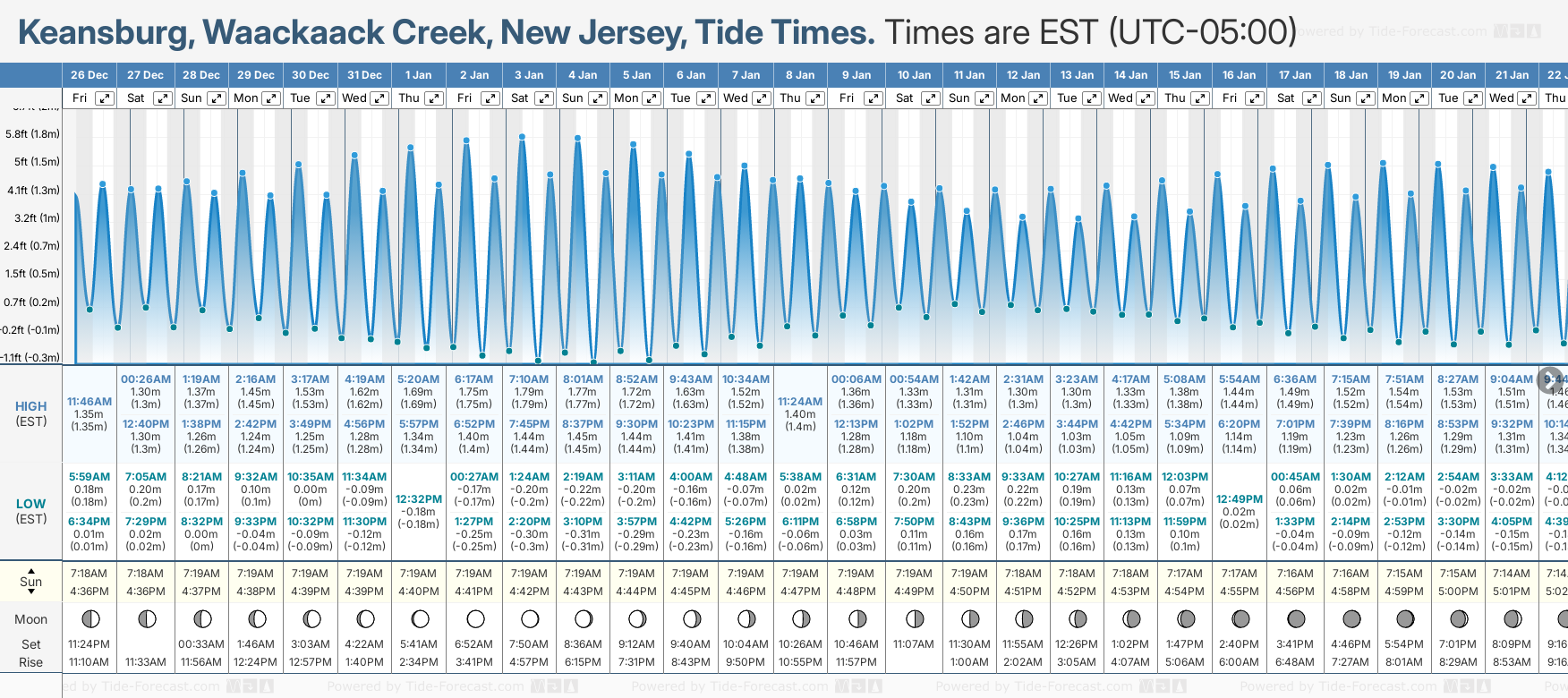 December and January Tide charts for Keansburg, Waackaack Creek: The tide charts below show the height, time and date of high and low tides for the next 30 days.