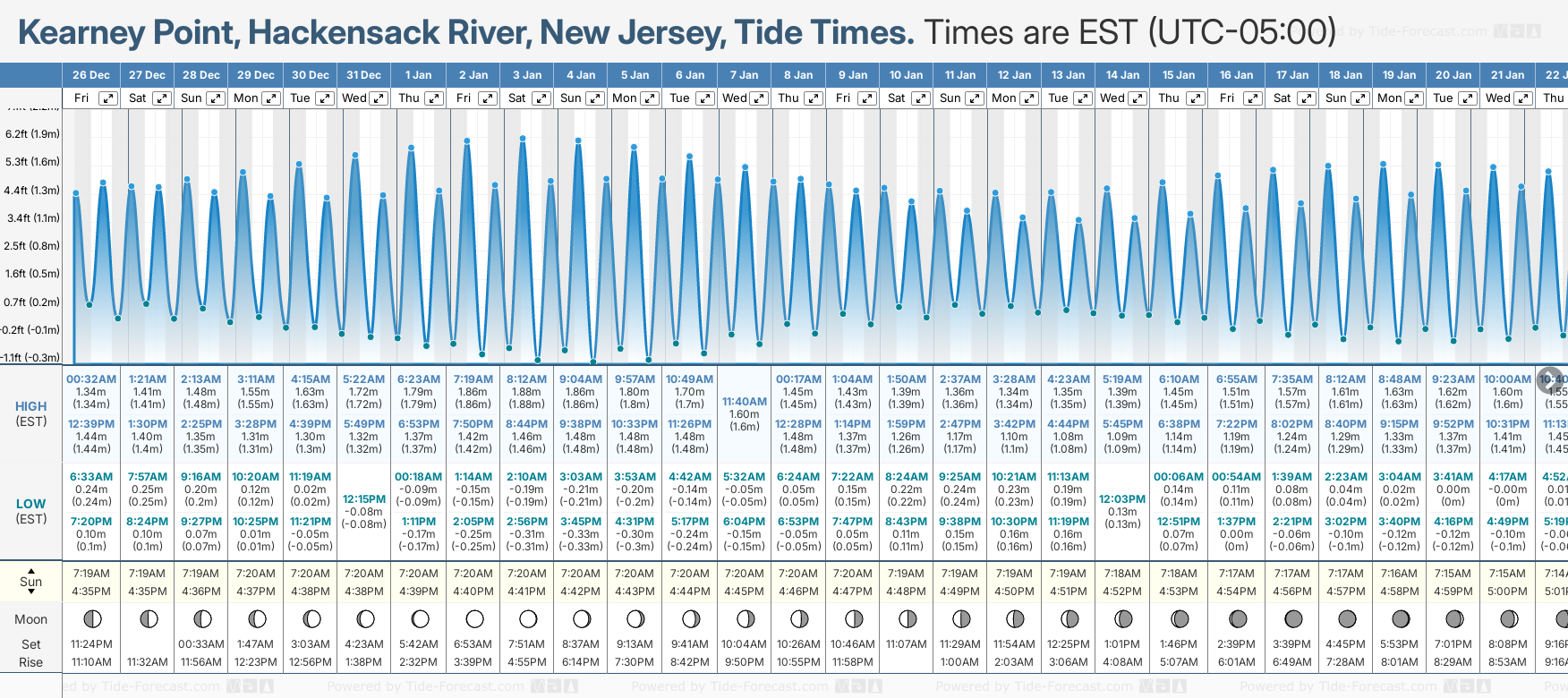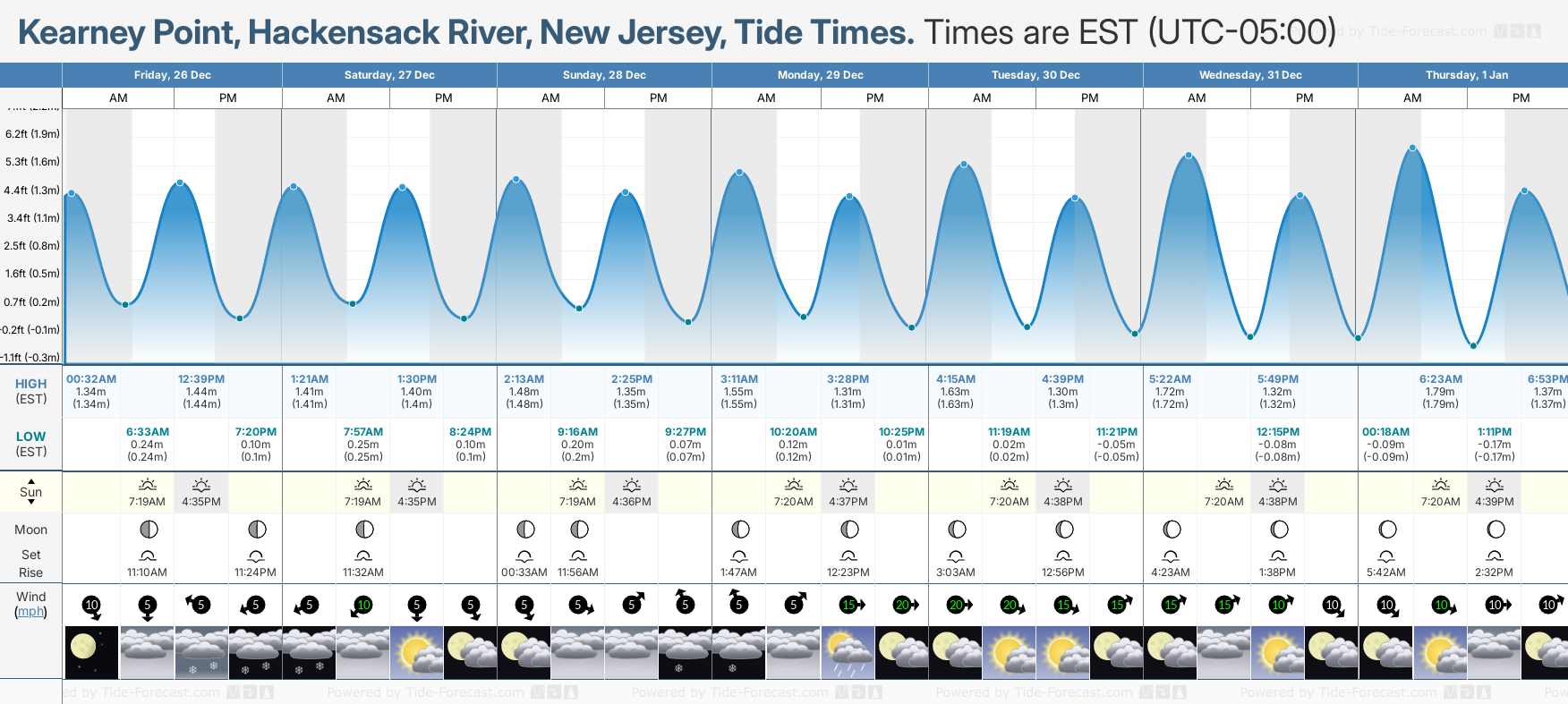 December and January Tide charts for Kearney Point, Hackensack River: The tide charts below show the height, time and date of high and low tides for the next 30 days.