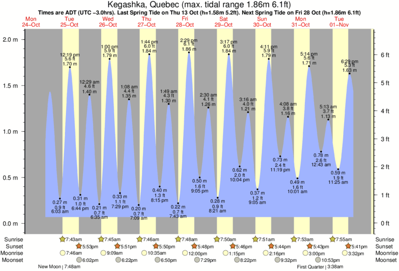Tide Times are AST (UTC -4.0hrs). Last Spring High Tide at Kegashka was on Sat 06 Dec (height: 1.92m 6.3ft). Next high Spring Tide at Kegashka will be on Tue 23 Dec (height: 1.66m 5.4ft).