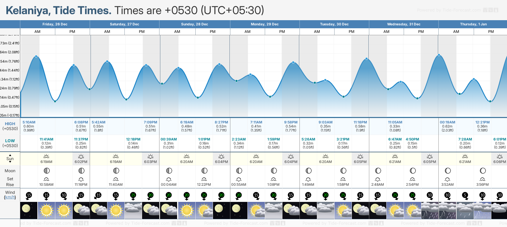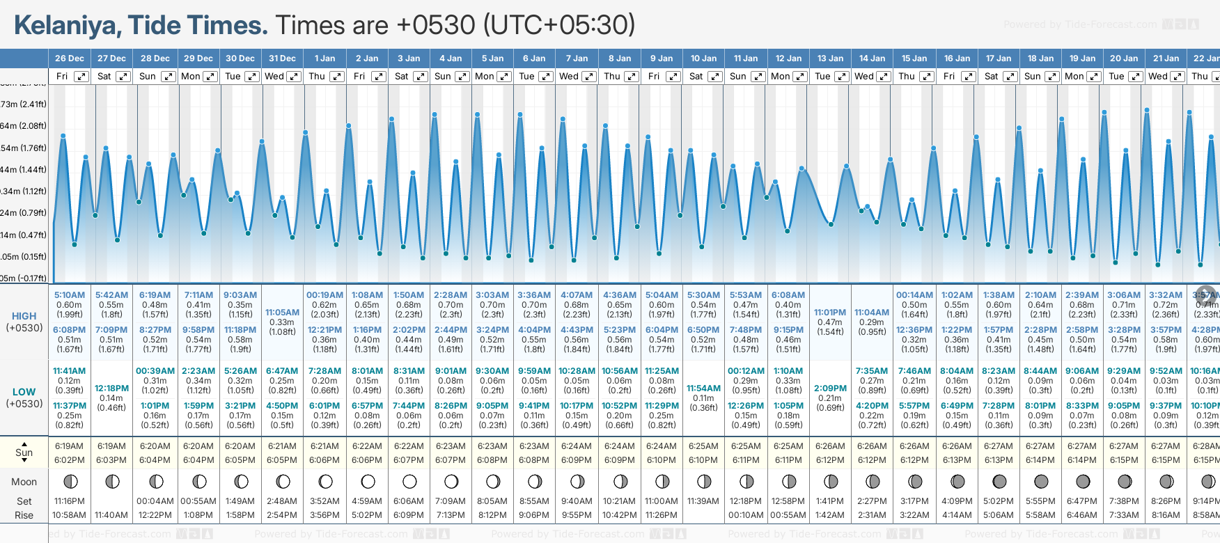 December and January Tide charts for Kelaniya: The tide charts below show the height, time and date of high and low tides for the next 30 days.