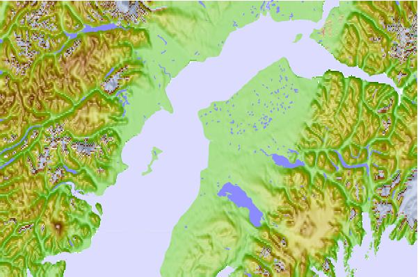 Use this relief map to navigate to tide stations, surf breaks and cities that are in the area of Kenai River entrance, Alaska.